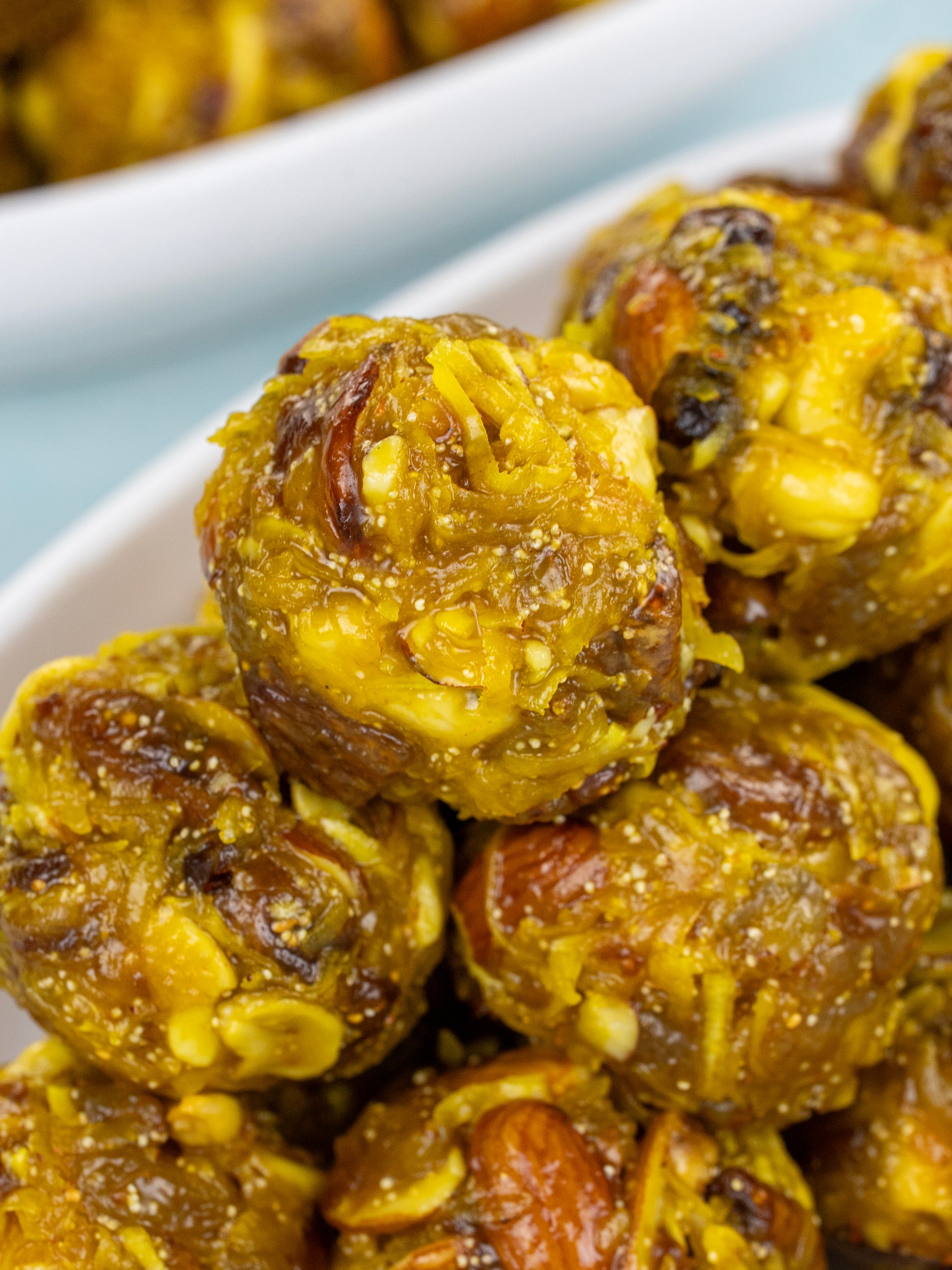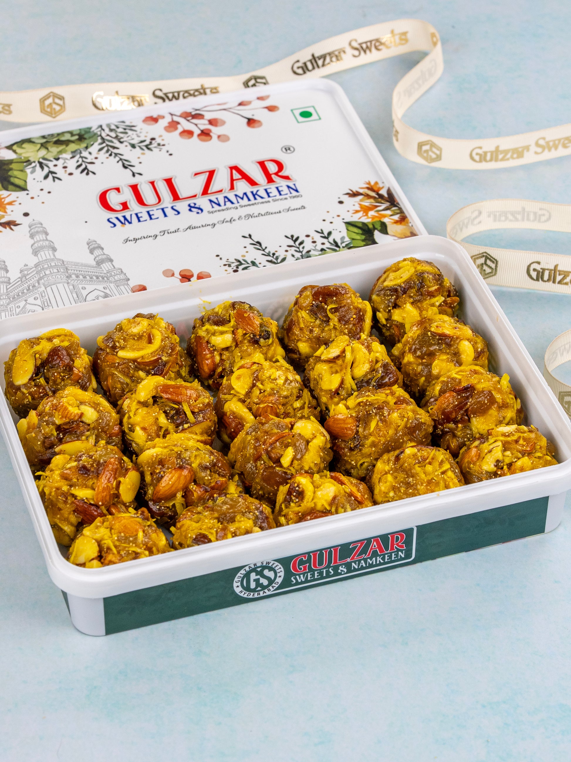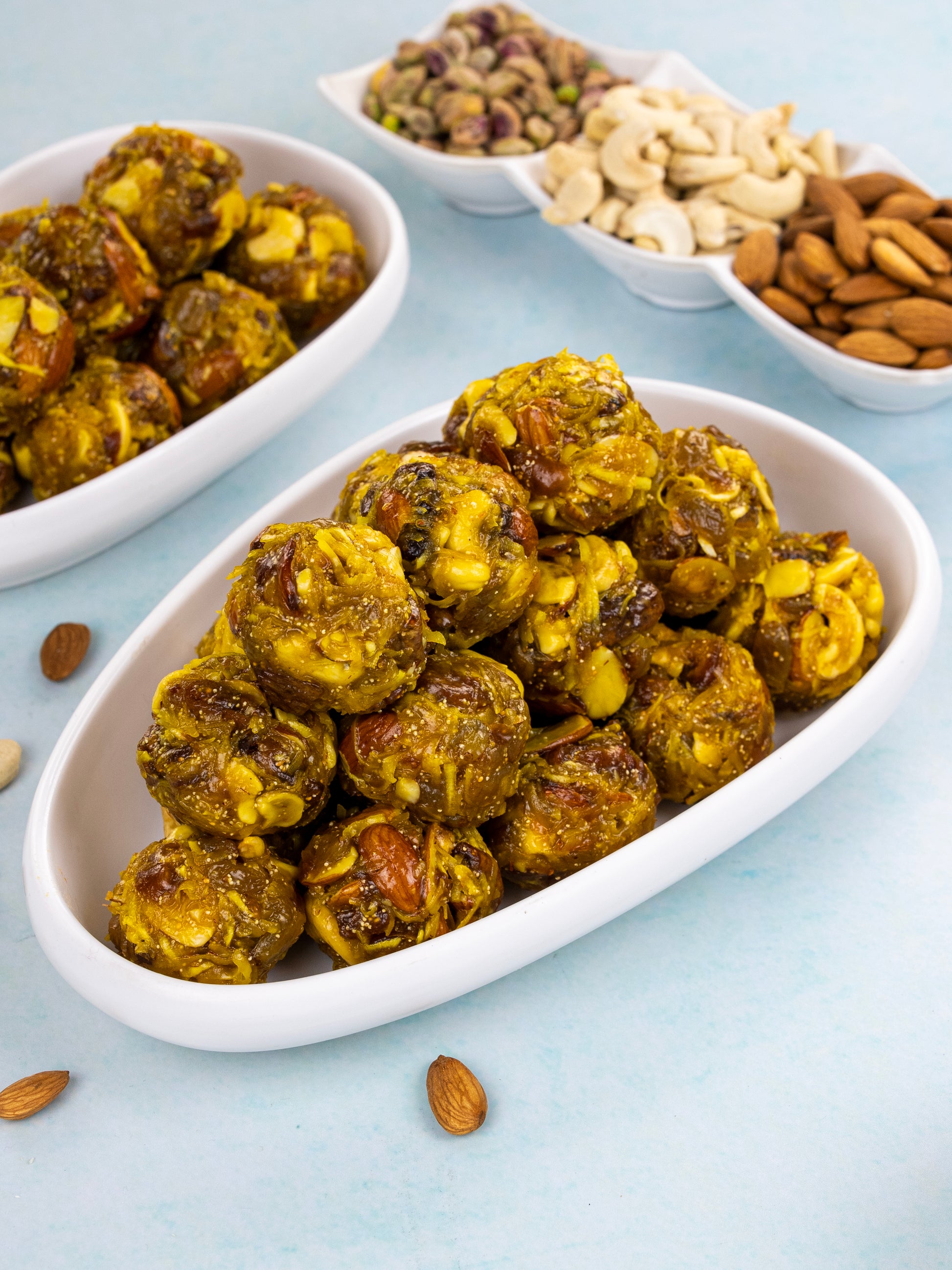 వివిధ రకాల ప్రీమియం డ్రై ఫ్రూట్స్ మరియు నెయ్యితో తయారు చేయబడిన పోషకమైన లడ్డూ.